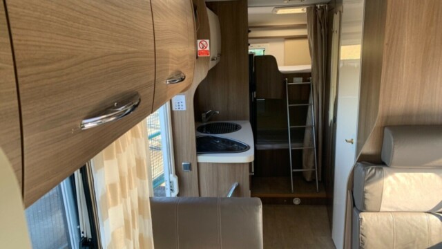There is a heating system in the living area which is useful in cooler weather; the vehicle is fully insulated and the windows are double-glazed. Other home comforts include Freeview digital television and DVD player. There is plenty of storage space for large items in the garage area at the rear of the vehicle while smaller items and clothes can be placed in the head height cupboards and the wardrobe inside the vehicle.
