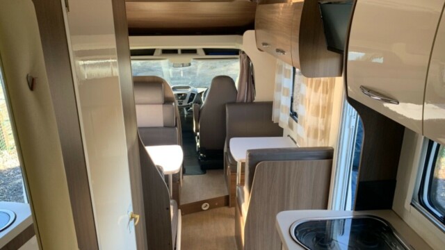 It has a permanent double bed in the space over the cab and bunk beds suitable for two adults or two children at the rear of the interior. A second double bed can be made up from the bench seats and dinette table in the middle of the vehicle. The seventh berth is a single bed made up from a very useful extra table and seats also in the lounge /dining area.