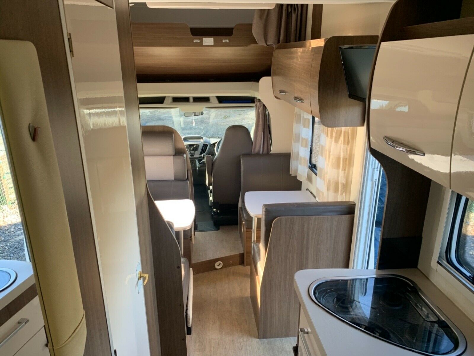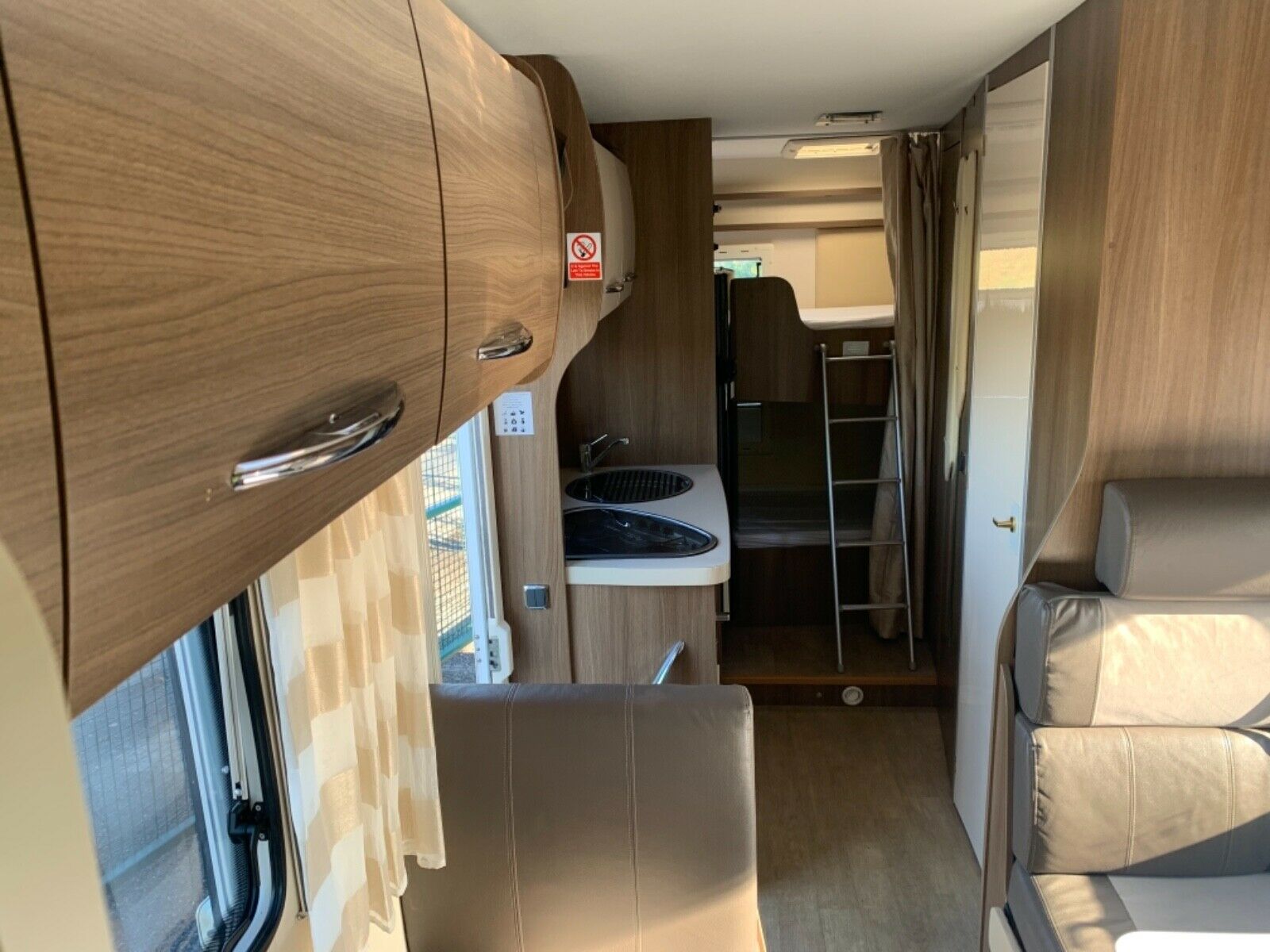 There is a heating system in the living area which is useful in cooler weather; the vehicle is fully insulated and the windows are double-glazed. Other home comforts include Freeview digital television and DVD player. There is plenty of storage space for large items in the garage area at the rear of the vehicle while smaller items and clothes can be placed in the head height cupboards and the wardrobe inside the vehicle.